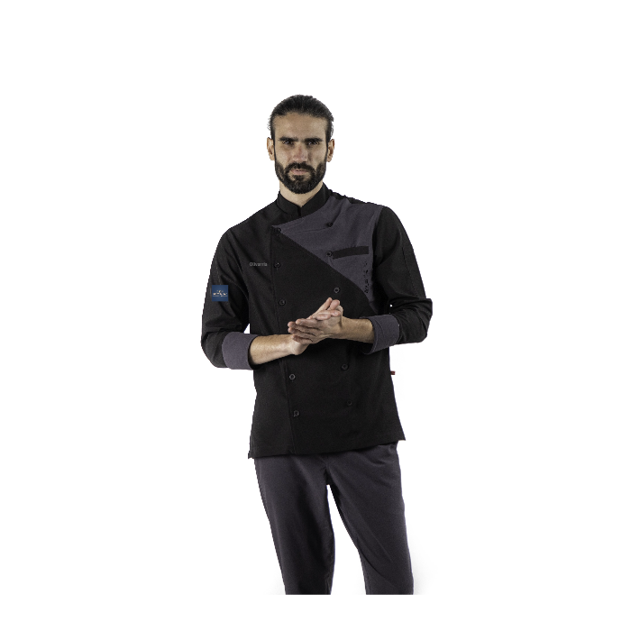 FILIPINA DE CABALLERO PARA CHEF EN COMBINACIÓN DE 2 COLORES, CON BOLSA DE VIVO EN DELANTERO DERECHO, CIERRE CRUZADO POR MEDIO DE 6 BOTONES, MANGA IZQUIERDA CON BOLSILLO PARA UTENSILIOS, ESPALDA LISA Y MANGAS 3/4. CONFECCIONADA EN TELA 100% REPELENTE A LÍQUIDOS.