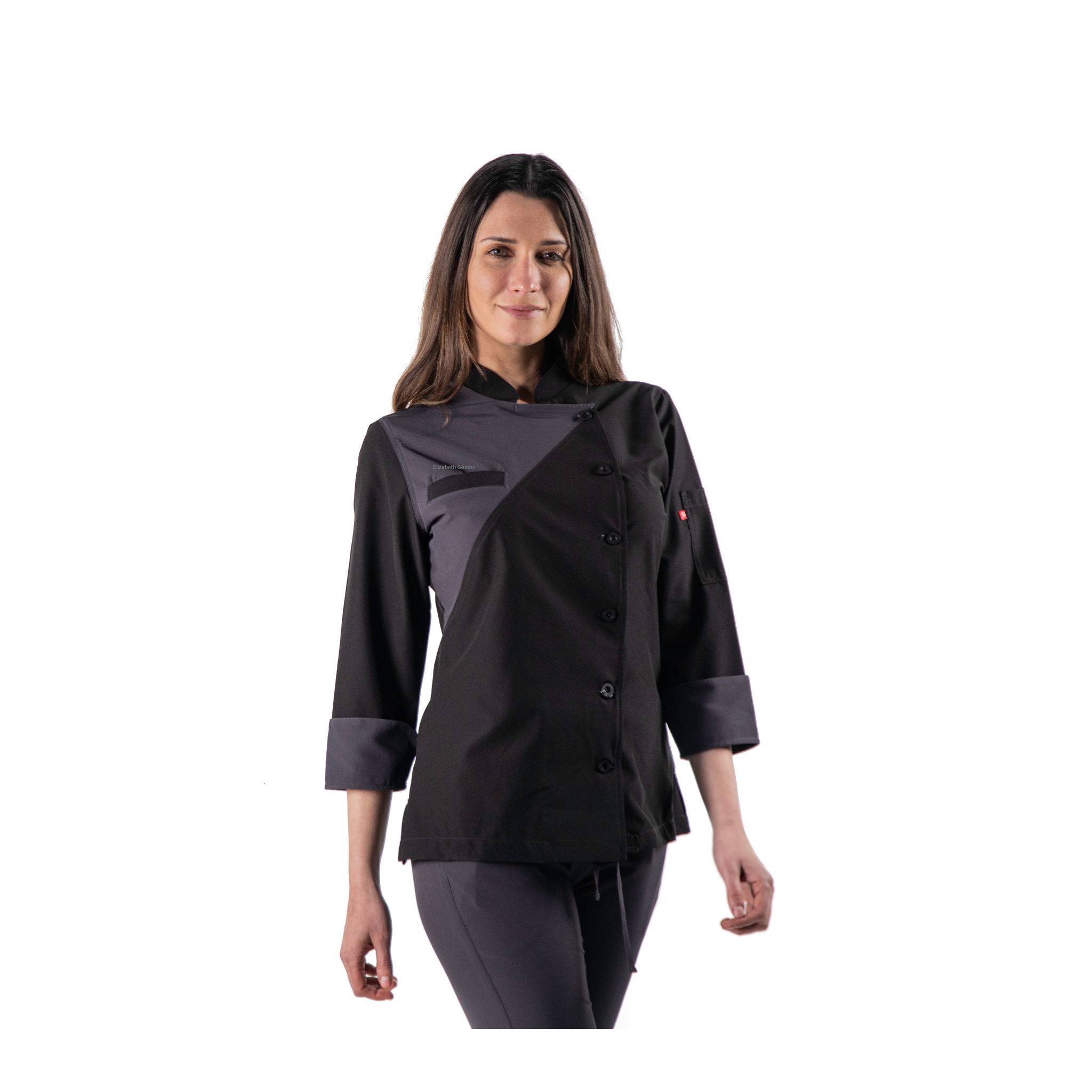 FILIPINA DE DAMA PARA CHEF EN COMBINACIÓN DE 2 COLORES, CON BOLSA DE VIVO EN DELANTERO DERECHO, CIERRE CRUZADO POR MEDIO DE 6 BOTONES, MANGA IZQUIERDA CON BOLSILLO PARA UTENSILIOS, ESPALDA LISA Y MANGAS 3/4. CONFECCIONADA EN TELA 100% REPELENTE A LÍQUIDOS.
