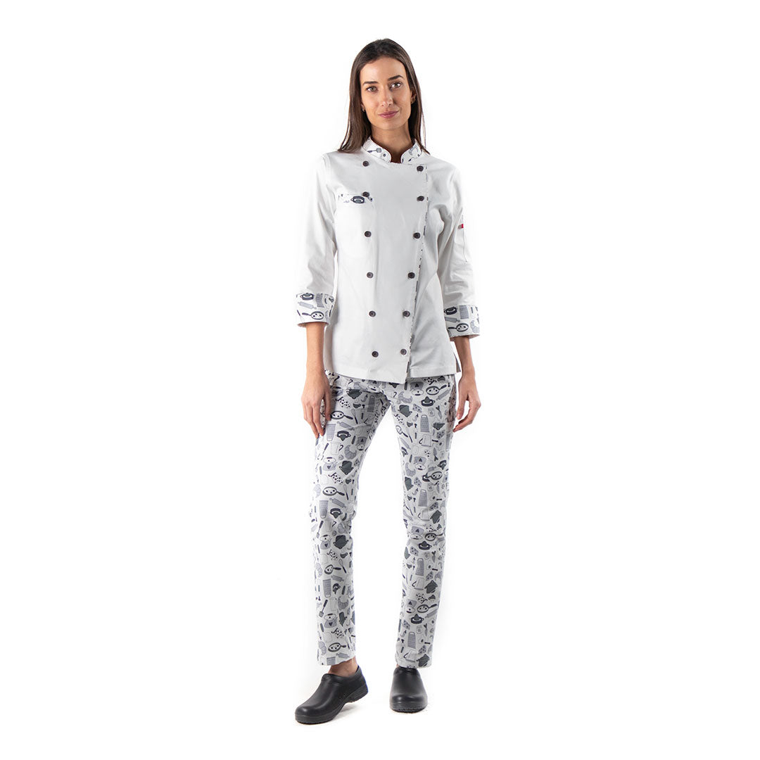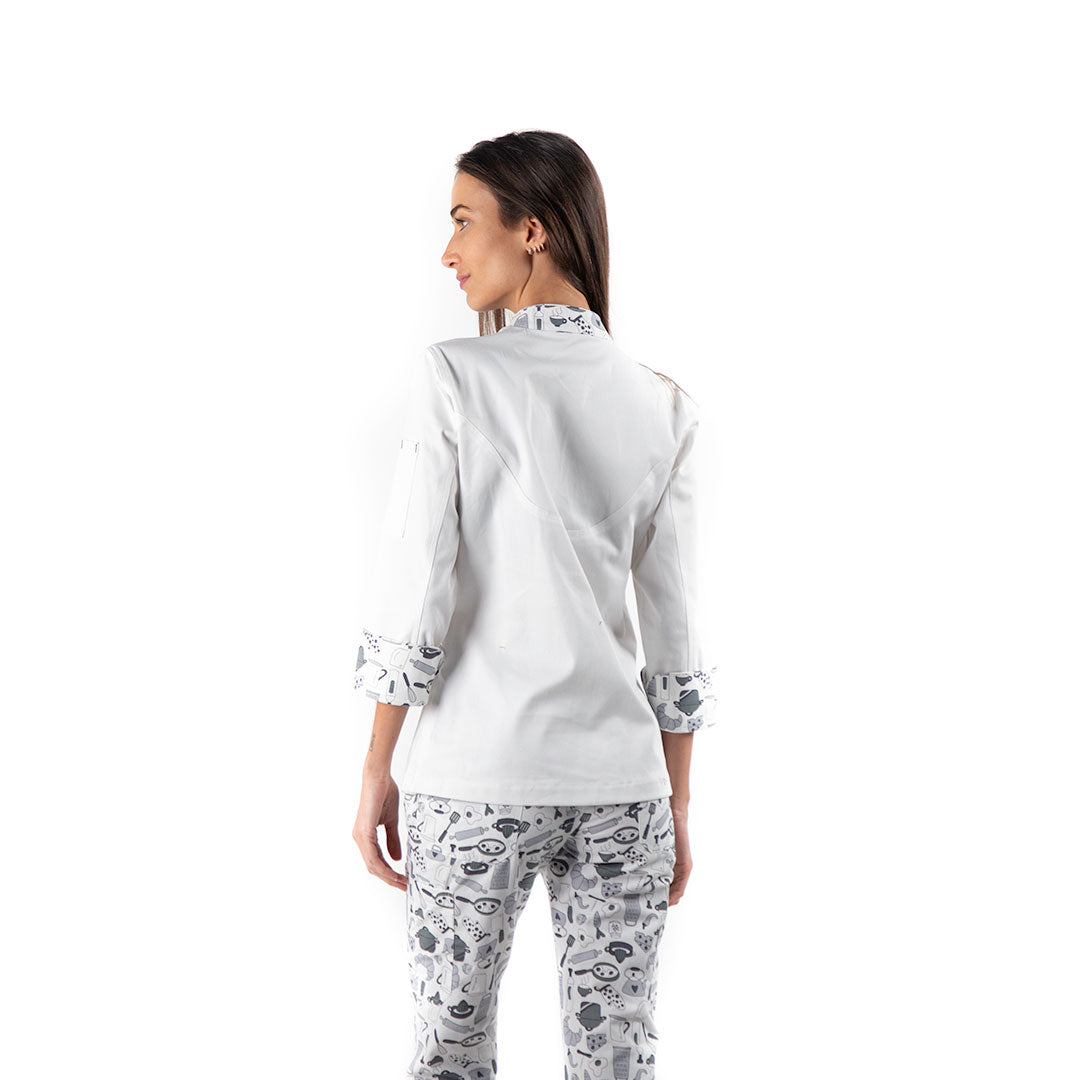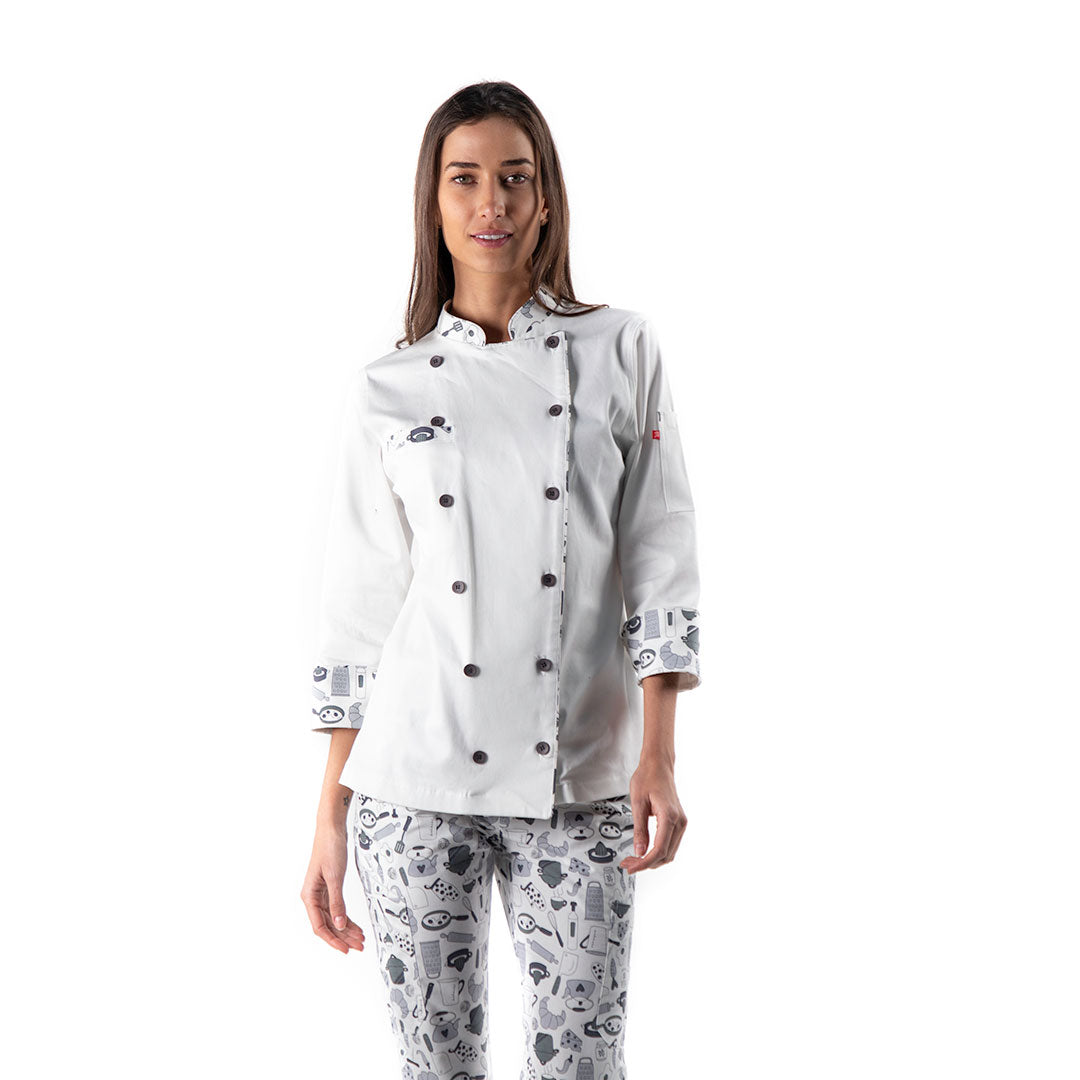 FILIPINA DE DAMA PARA CHEF CONFECIONADA EN TELA BASE DE UN SOLO COLOR Y COMBINACIONES EN TELA ESTAMPADA, CIERRE CRUZADO POR MEDIO DE 3 BOTONES, MANGA IZQUIERDA CON BOLSILLO PARA UTENSILIOS, ESPALDA CON CORTE SEMICIRCULAR Y MANGAS 3/4.