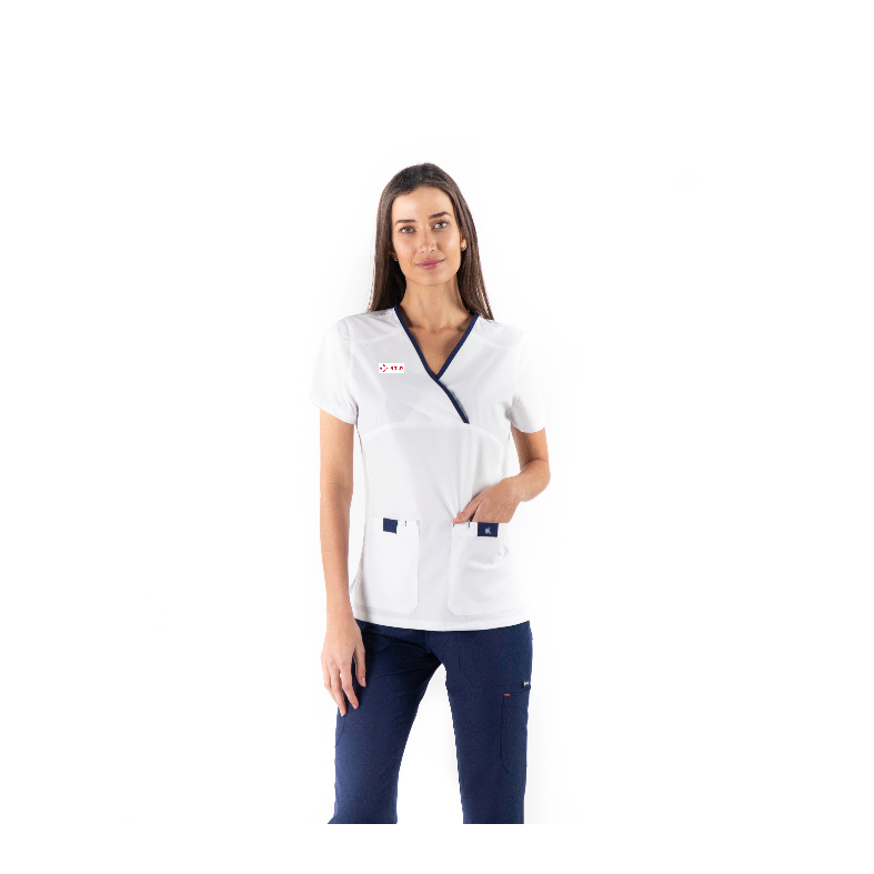 FILIPINA MÉDICA PARA DAMA, DE CUELLO EN V, CON 2 BOLSAS EN PARTE BAJA . COMBINACIÓN DE COLOR EN VIVOS. CONFECCIONADA EN TELA 100% REPELENTE A LÍQUIDOS.