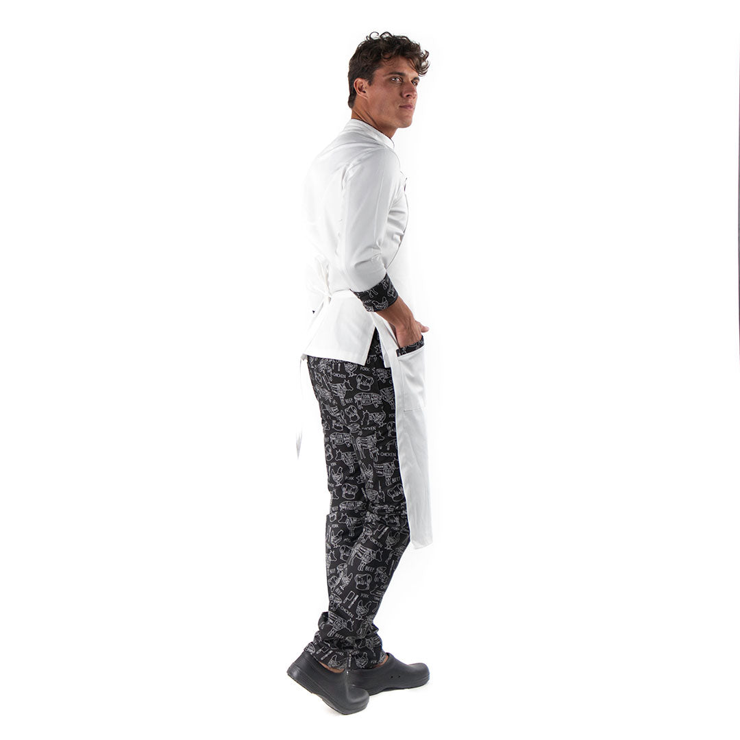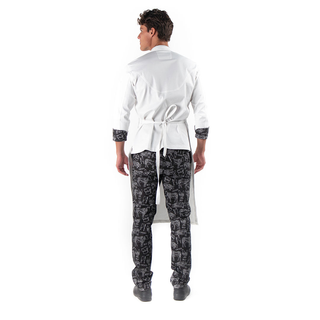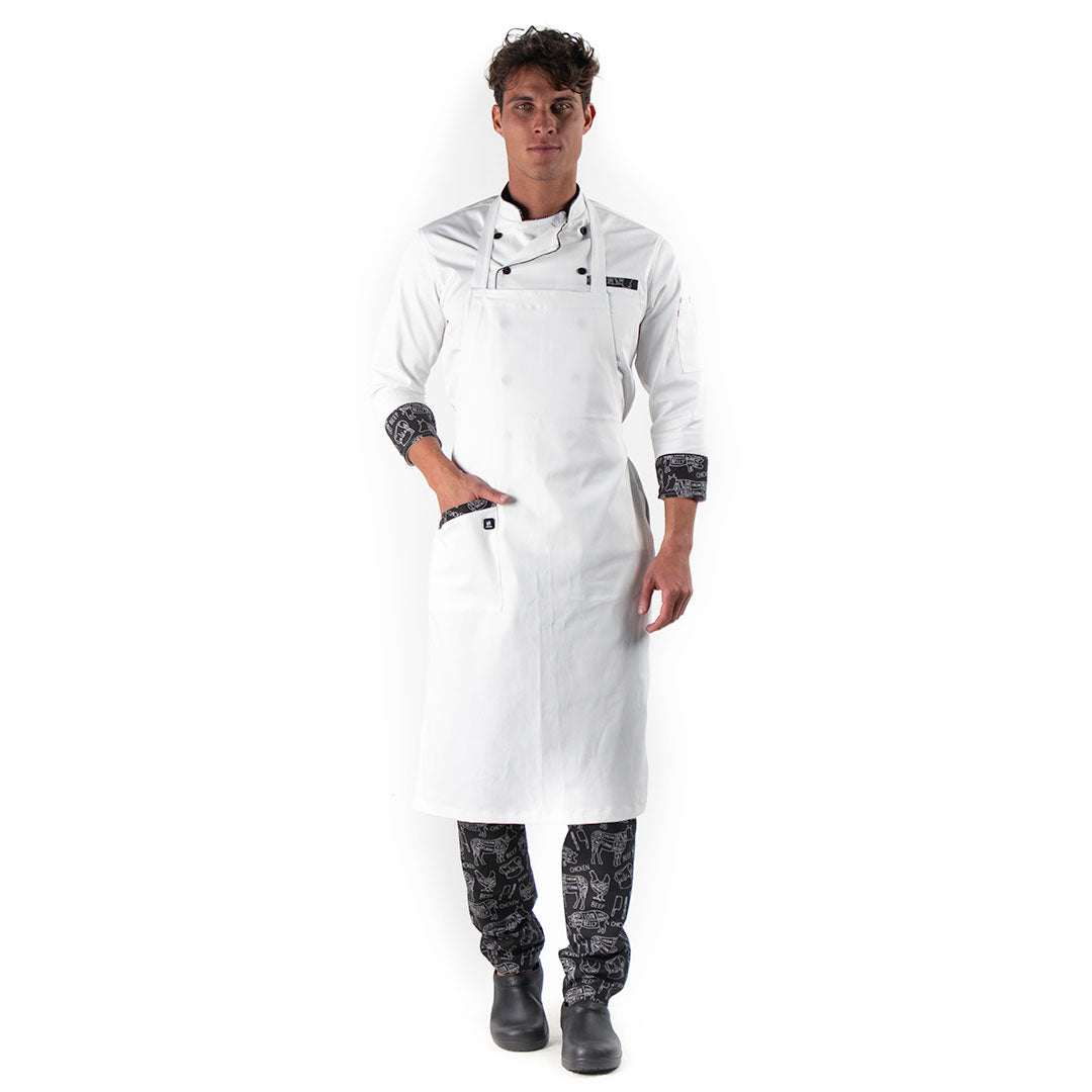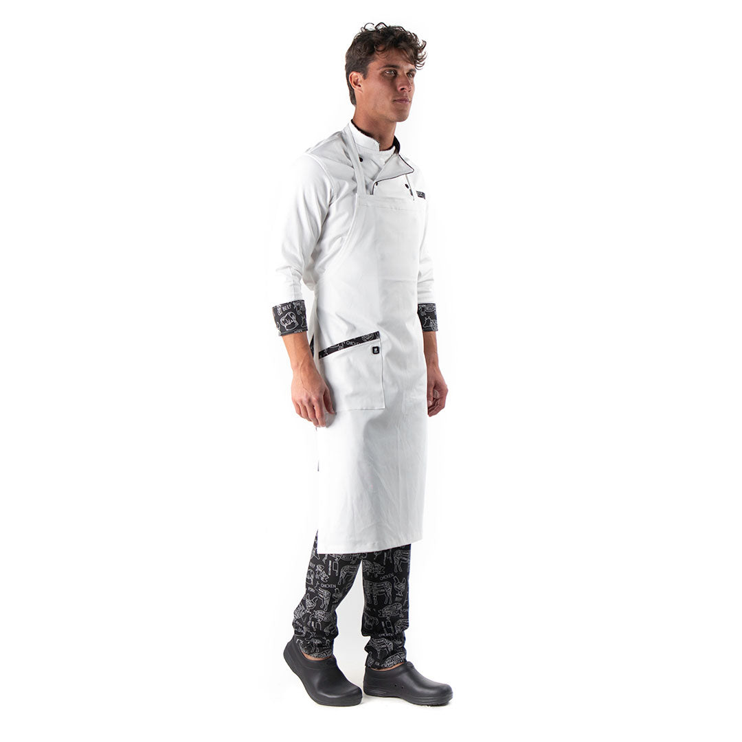 MANDIL PARA CHEF CON DISEÑO Y TAMAÑO UNISEX, CINTAS EN CINTURA AJUSTABLES, BOLSA DE VIVO CON DETALLE ESTAMPADO EN PARTE BAJA